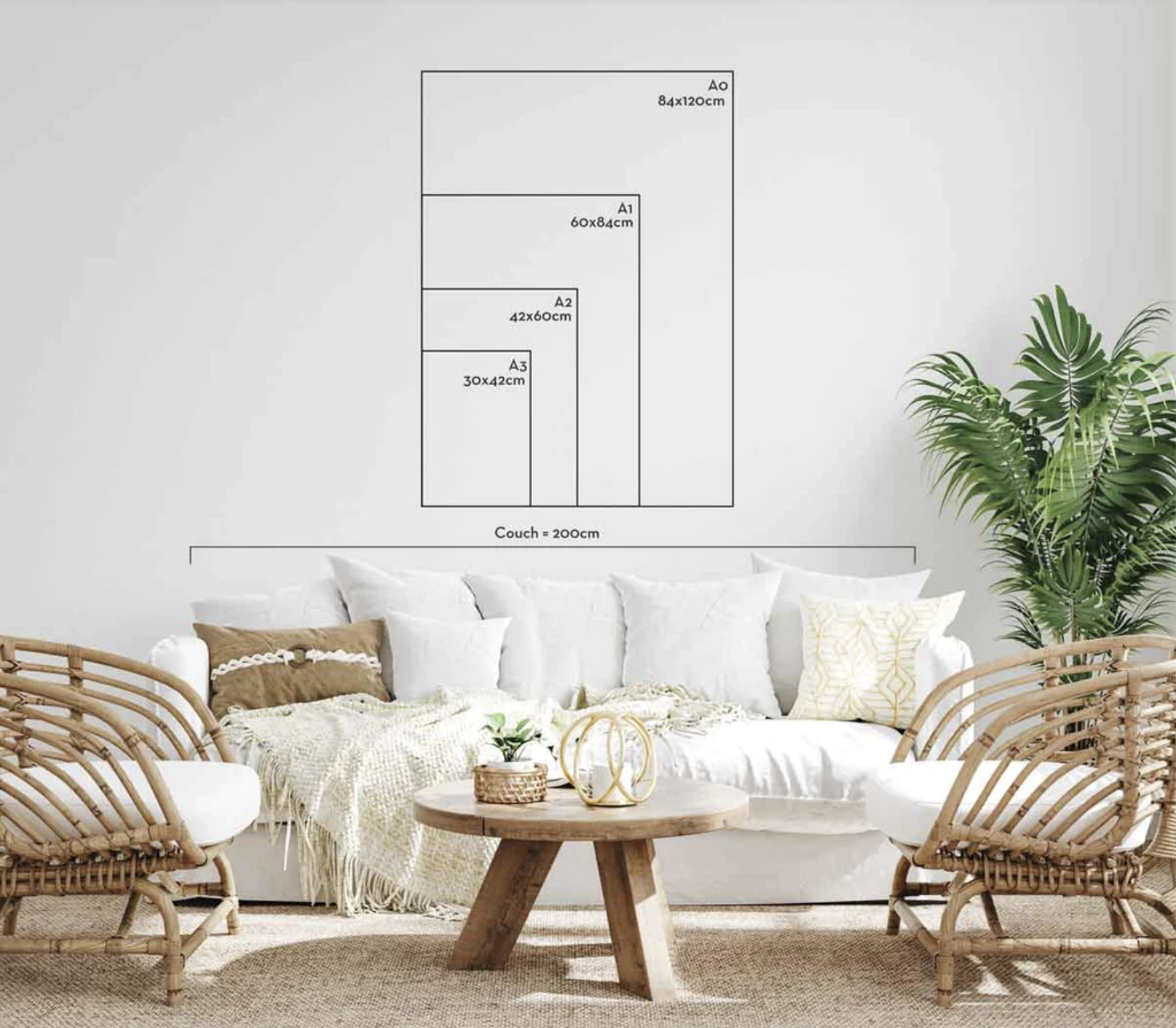 Both of them are available in all the different sizes we produce. And since we mentioned that and if you have some second thoughts about which print size is better for your home decor, here you have each one of the dimensions and also a comparative photo with some of them. That might give you an idea of how it would look in your home.